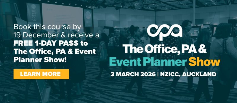 *1 1-Day Pass Ticket per person for The Office, PA & Event Planner Show, for the registered attendee or other person from same organisation, booked on any currently advertised dates for the following public training courses: Fundamentals of the Modern EA, Governance & Board Management for EAs & PAs, Leadership Development for Women – offer valid until 19 December 2025.